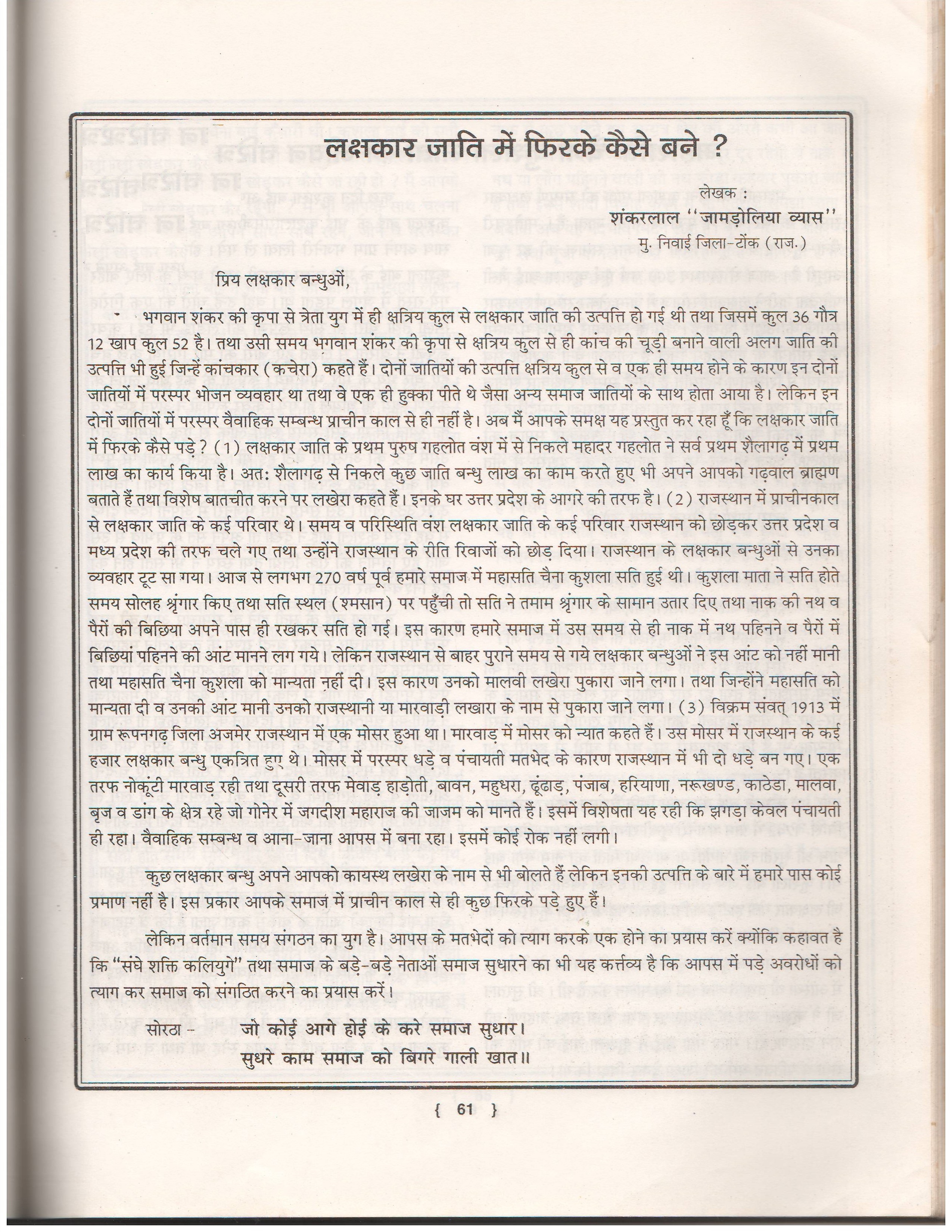 लखेरा समाज का इतिहास, लखेरा शब्द की उत्पत्ति कैसे हुई?- लखेरा भारत में पाई जाने वाली एक जाति जो पारंपरिक रूप से लाख (लाह) के कलात्मक आभूषण, चूड़ियां, कंगन और खिलौना बनाने और बेचने का कार्य करते हैं. इन्हें लखारा, लक्षकर,लक्षकार, लखपति, लहेरी आदि नामों से भी जाना जाता है. महाराष्ट्र में इन्हें लखेरी कहा जाता है लाह के सामान बनाना इस जाति का अंतर्निहित विरासत रहा है. इस जाति के लोग प्राचीन काल से लाह के बने चूड़े, पाटले और कलात्मक सामान गांव-गांव में जाकर बेच कर अपना जीवन-यापन करते आए हैं. इस समुदाय के कुछ सदस्य अब दुकानदार हैं. साथ ही यह विभिन्न क्षेत्रों और आधुनिक नौकरी-पेशा में भी अपनी मजबूत उपस्थिति दर्ज करा रहे हैं। प्राचीन काल से ही लखेरा जाति का समाज में महत्वपूर्ण स्थान रहा है. हिंदू संस्कृति में चूड़ा अमर सुहाग का प्रतीक रहा है. वर्त्तमान में भी देश के सभी हिस्सों मे महिलाएं चूड़ियां पहनती हैं. इस समुदाय के अधिकांश लोग यह दावा करते हैं कि उनके पूर्वज कायस्थ और राजपूत थे. इस बात को समर्थन करने के लिए इस जाति ने खुद को राजपूतों की तरह सूर्यवंशी और सोमवंशी उप जातियों में विभाजित कर लिया है. आइए जानते हैं लखेरा समाज का इतिहास, लखेरा शब्द की उत्पत्ति कैैैसे हुई?